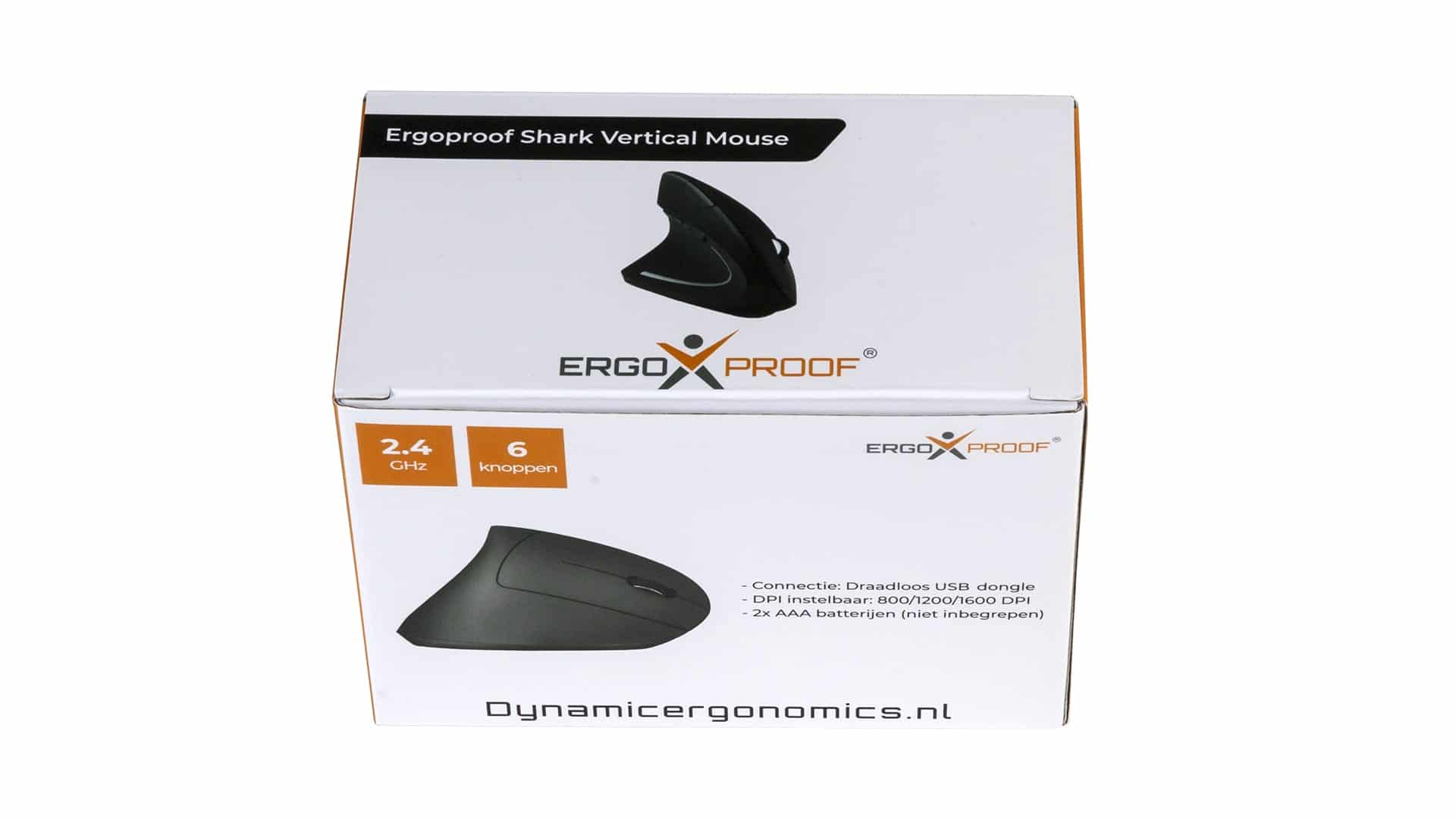 De Ergoproof Shark verticale muis heeft zes knoppen: linksklikken, rechtsklikken, pagina vooruit, pagina terug en een scrollwiel (waarmee je kunt scrollen en de DPI punt instellen). De muis is draadloos (2.4 GHz); je kunt hem verbinden met behulp van een USB-dongel. Hij werkt op met behulp van twee AAA-batterijen. met een USB-dongel. De DPI is instelbaar, waarbij je kunt kiezen uit 800, 1200 of 1600 DPI.