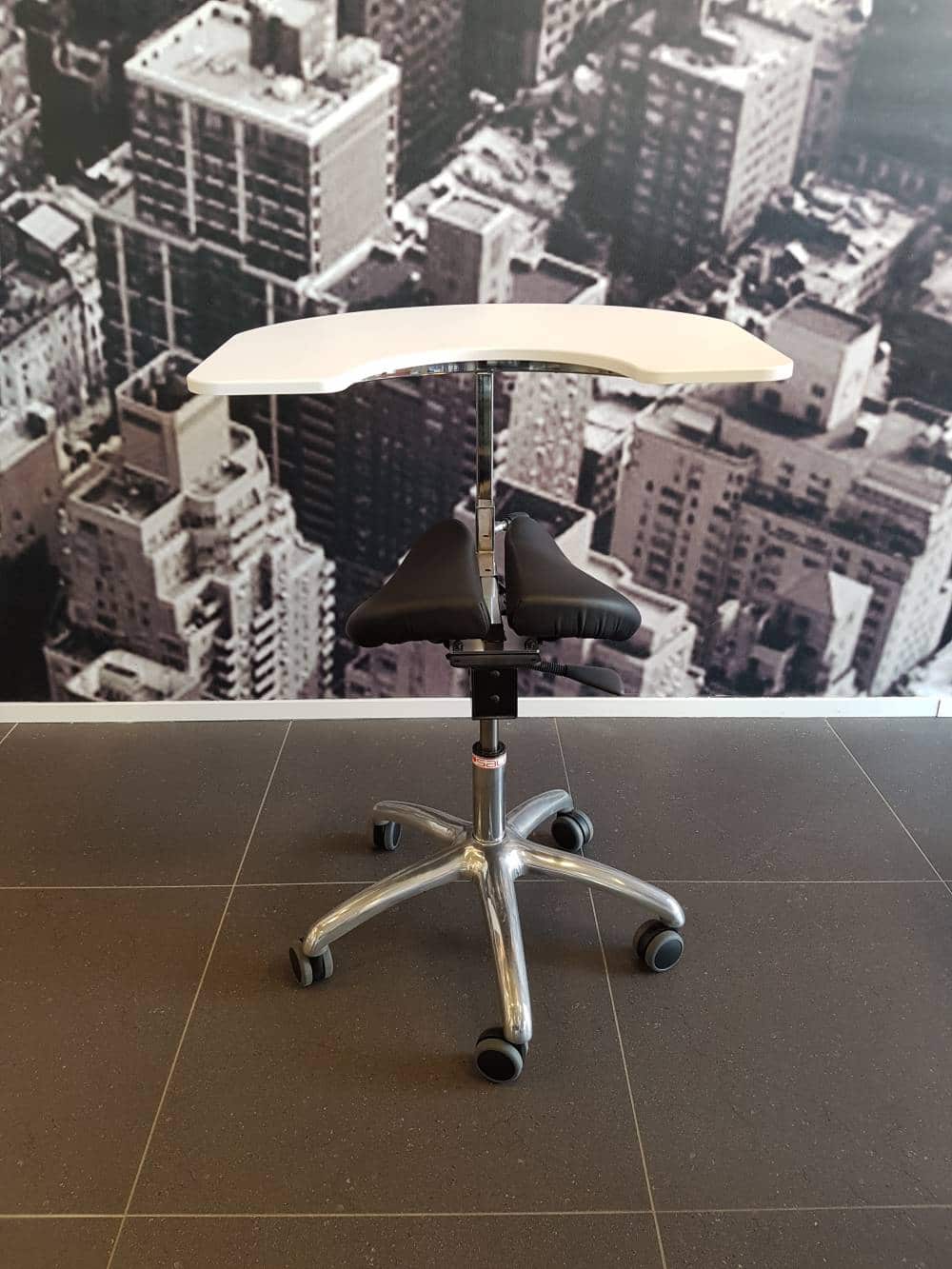 Het zadel van de Salli Mobiele Werkplek is vervaardigd uit leder en bestaat uit twee delen. De vorm van het zadel stimuleert u om een rechtop zittende houding aan te nemen. Doordat u de tafel in hoogte kunt aanpassen, voorkomt u dat u erg ‘krom’ moet zitten tijdens het werken.
