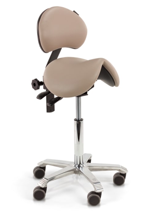 Je kunt een rugleuning toevoegen aan je zadelkruk. Dat geeft je de mogelijkheid om ergens tegenaan te leunen wanneer je zit. Sommige mensen ervaren dat als prettiger. Het nadeel van de rugleuning, is dat je direct ook minder actief zit: de rugleuning doet immers het werk om je rechtop te houden. Je zit daardoor passiever. De rugleuning is in hoogte en hoek verstelbaar.